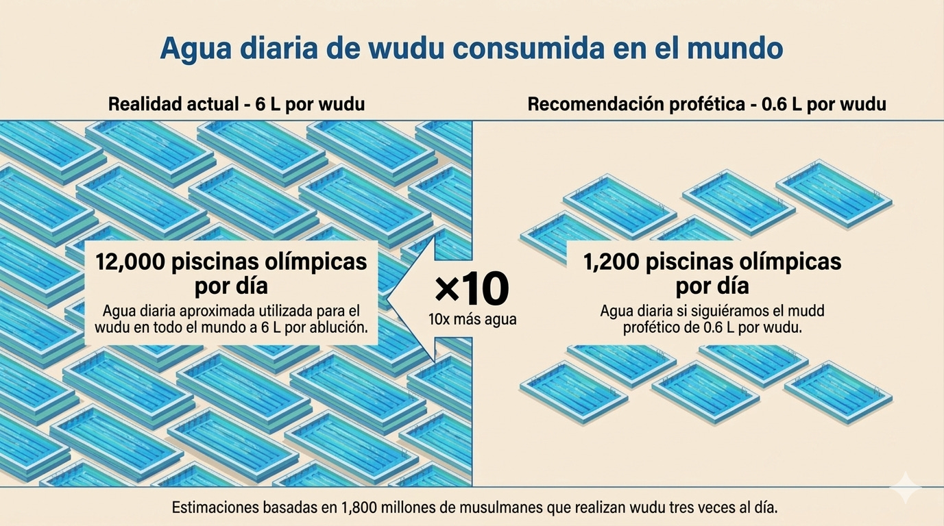 Hay 1,800 millones de musulmanes en el mundo, y la mayoría realiza el wudu al menos tres veces al día. Con el mínimo profético de 0.6 litros por ablución, eso equivale a más de 3 mil millones de litros de agua usados solo para el wudu, cada día. Pero en el artículo anterior encontramos que la mayoría de las personas usa, en promedio, 10 veces más agua, lo que significa ¡30 mil millones de litros de agua al día!