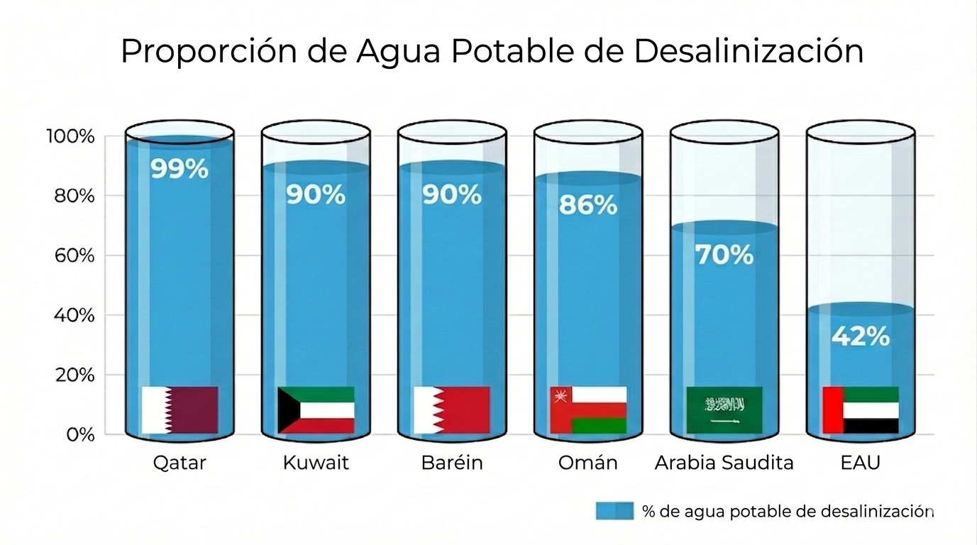 Arabia Saudita consume alrededor de 300,000 barriles de petróleo al día solo para operar sus plantas de desalinización — aproximadamente el 20 por ciento de la producción total de petróleo del país. No para alimentar ciudades ni fábricas. Para fabricar el agua que sale de tu llave.
